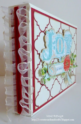This is the side view of the card. I have decorated the spine with ruffled lace which I have misted with Bronze Tattered Angels Glimmer mist and a strip of red velvet ribbon. Embellished the front side with cut out design and sentiment from the same paper collection.